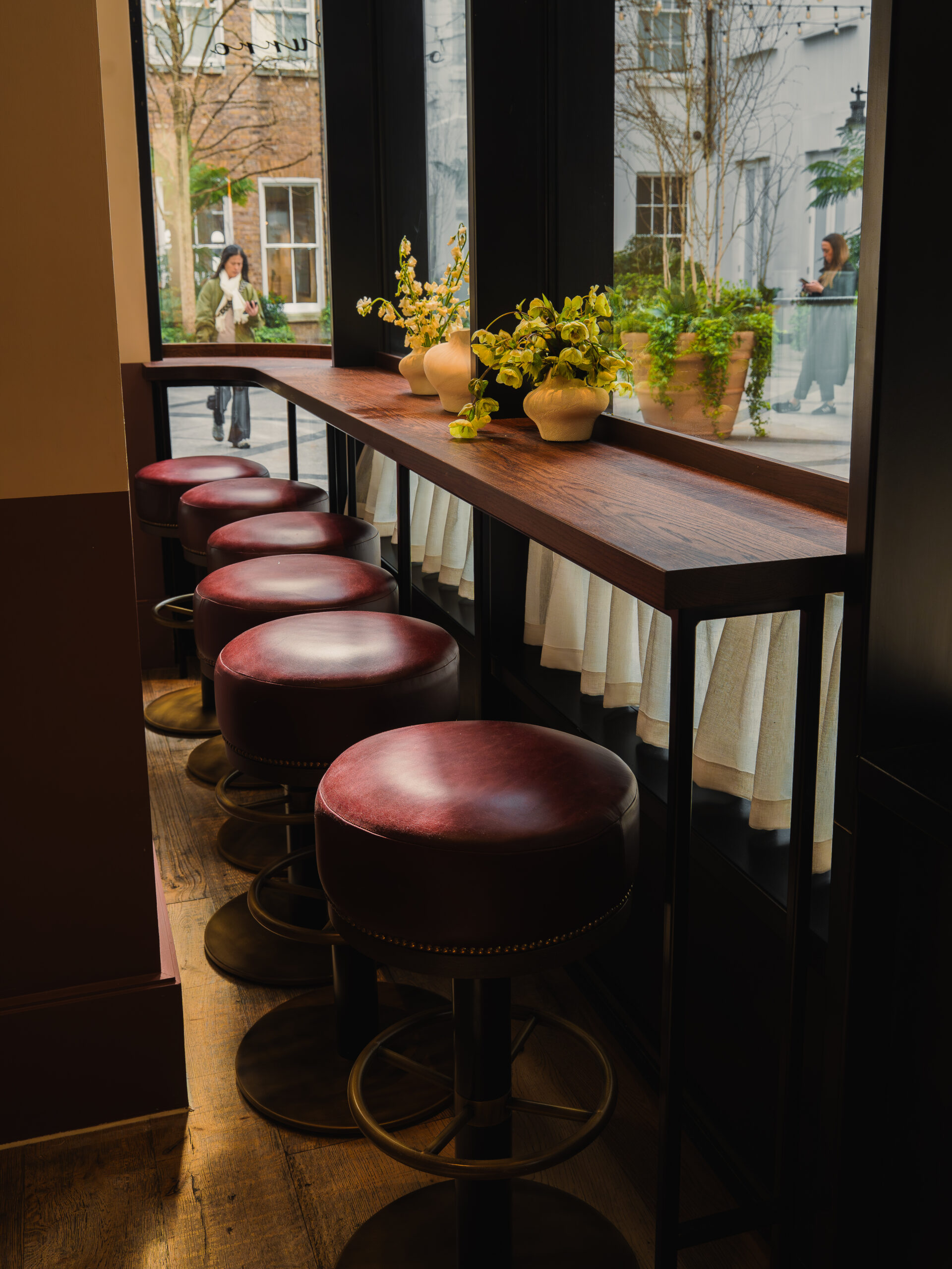 The bar table, designed to offer a more relaxed seating area with views out to the courtyard, was crafted by our team with bespoke metalwork. There’s also a wide range of joinery throughout the space, including waiter stations and a bespoke coat unit that helps with the overall functionality and flow of the restaurant.